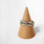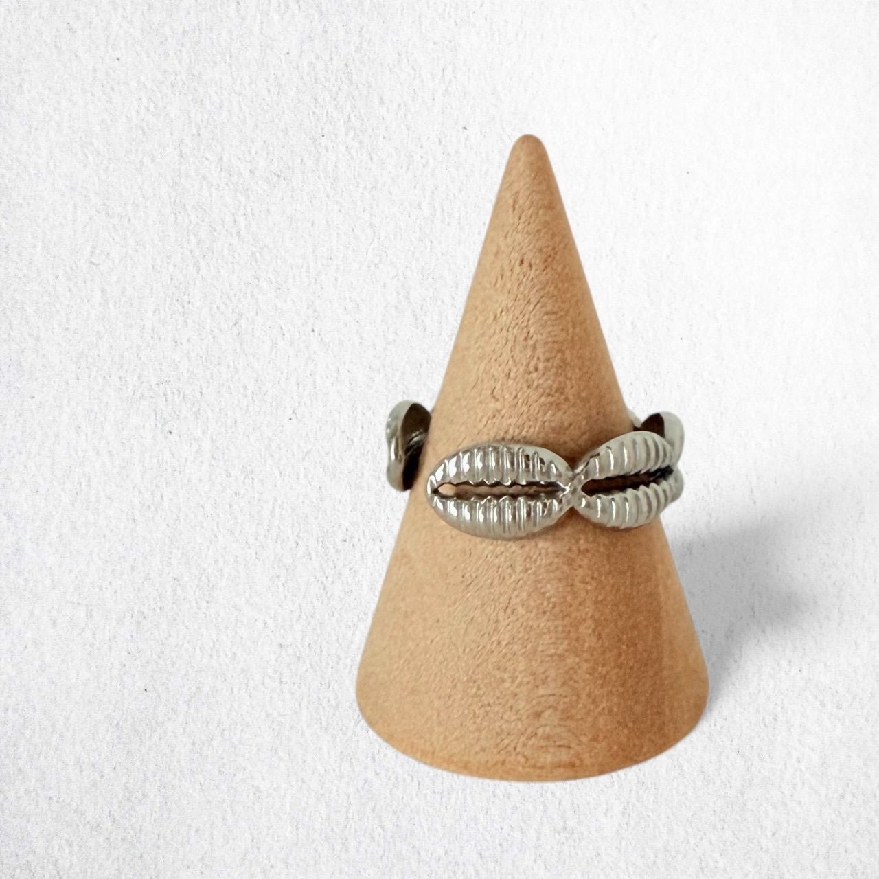 Anillo de acero regulable con diseño de pequeñas caracolas del mar, disponible únicamente en color plateado.