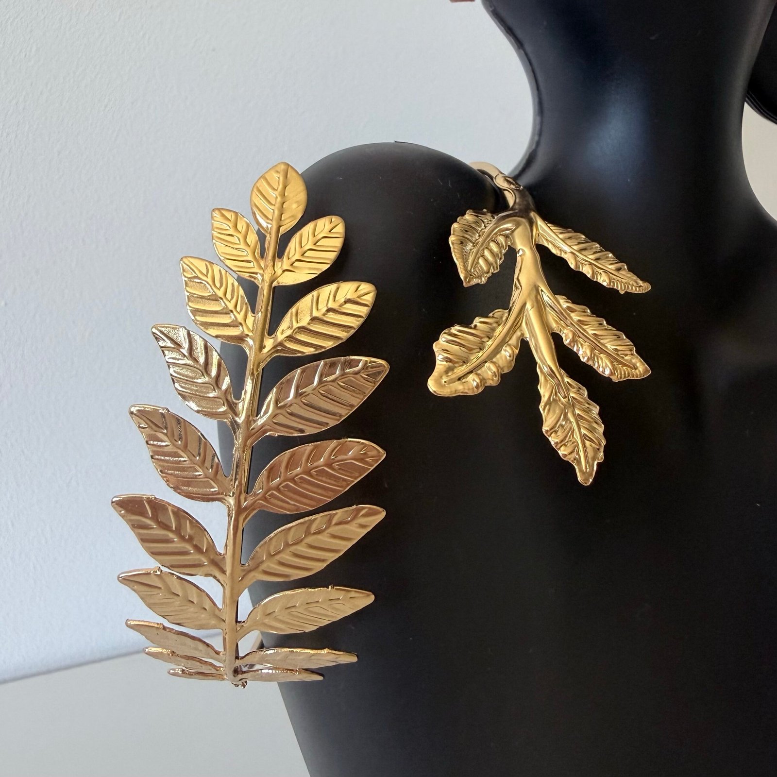 Brazalete de brazo, abierto y regulable en color dorado inspirado en hojas.