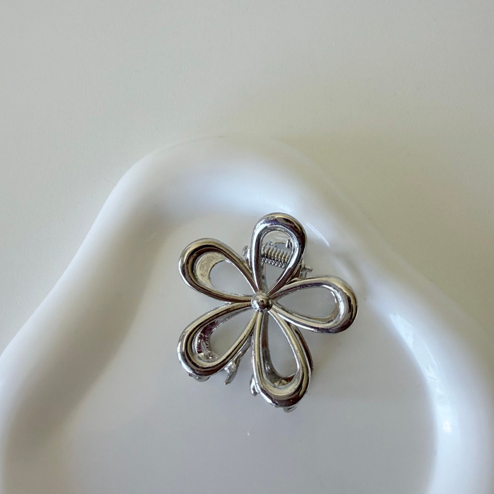 Broche tipo pinza con forma de flor color plateado, de aproximadamente 3–4 cm de diámetro.