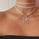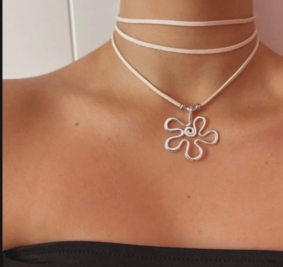 Collar estilo choker, dije en forma de flor color plateado.