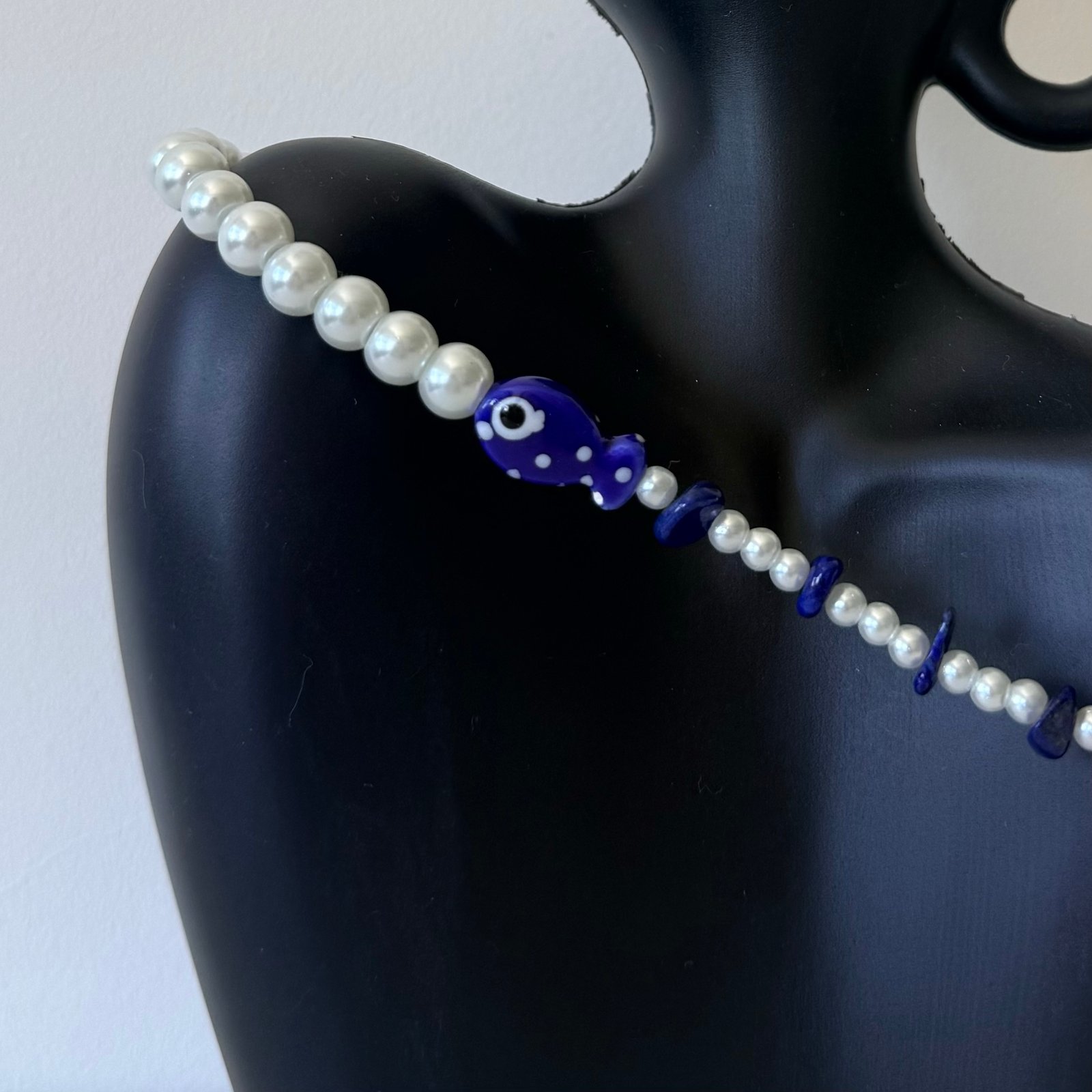 Collar handmade de perlas blancas pequeñas intercaladas con piedritas azules irregulares y detalle central combinado de pez con ojo protector.